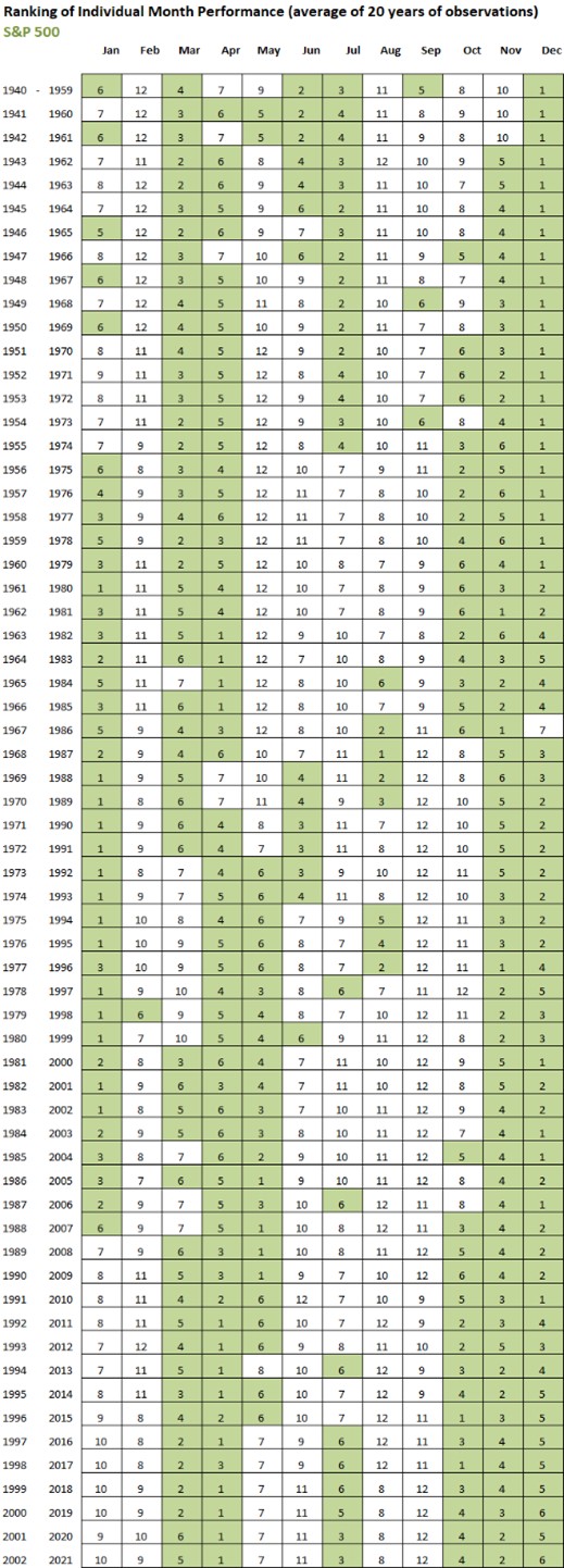 And if we take the returns five years at a time (so, from 1940‐1944, 1941‐1945…2017‐2021), and rank the months, we see this: